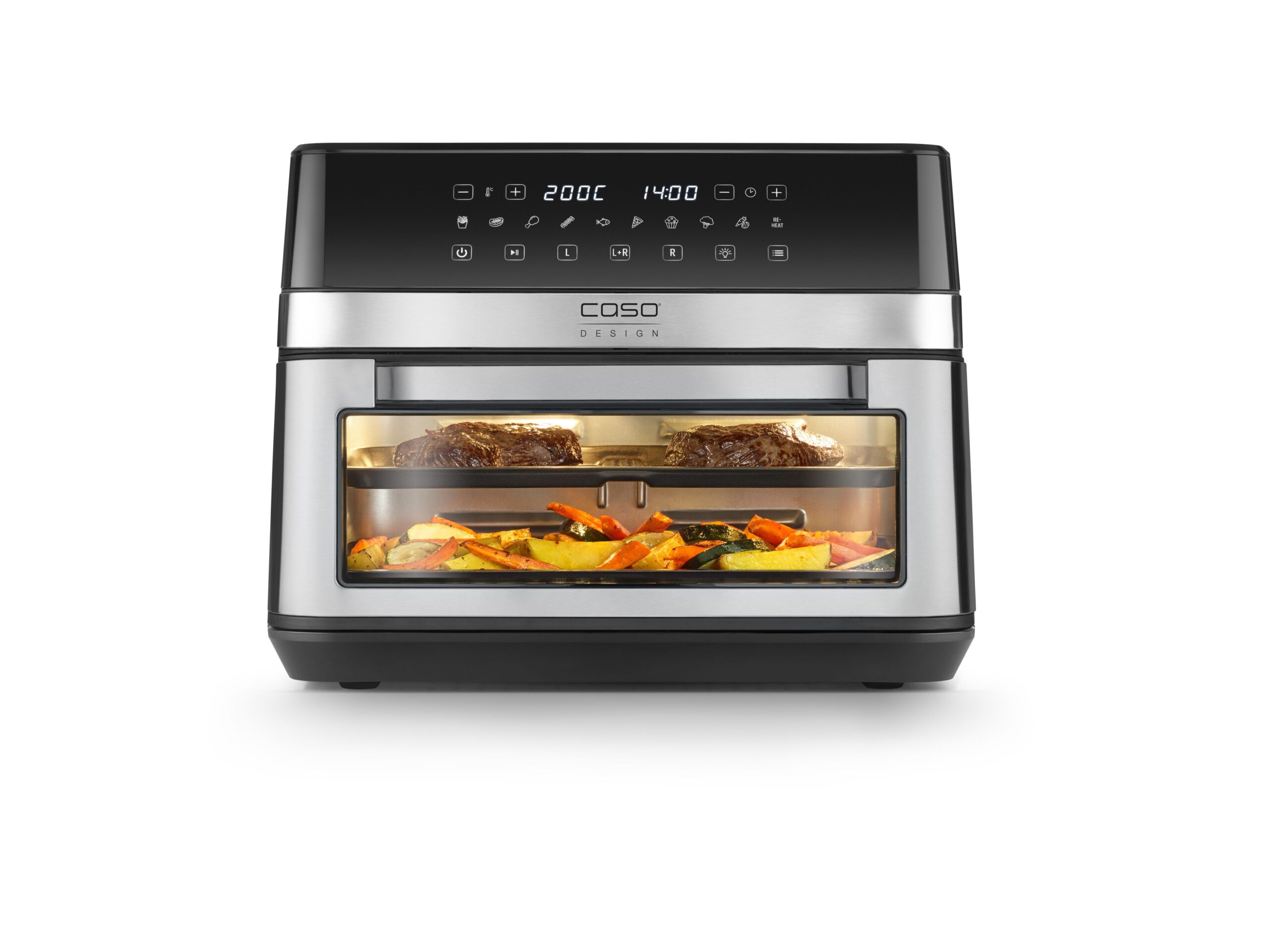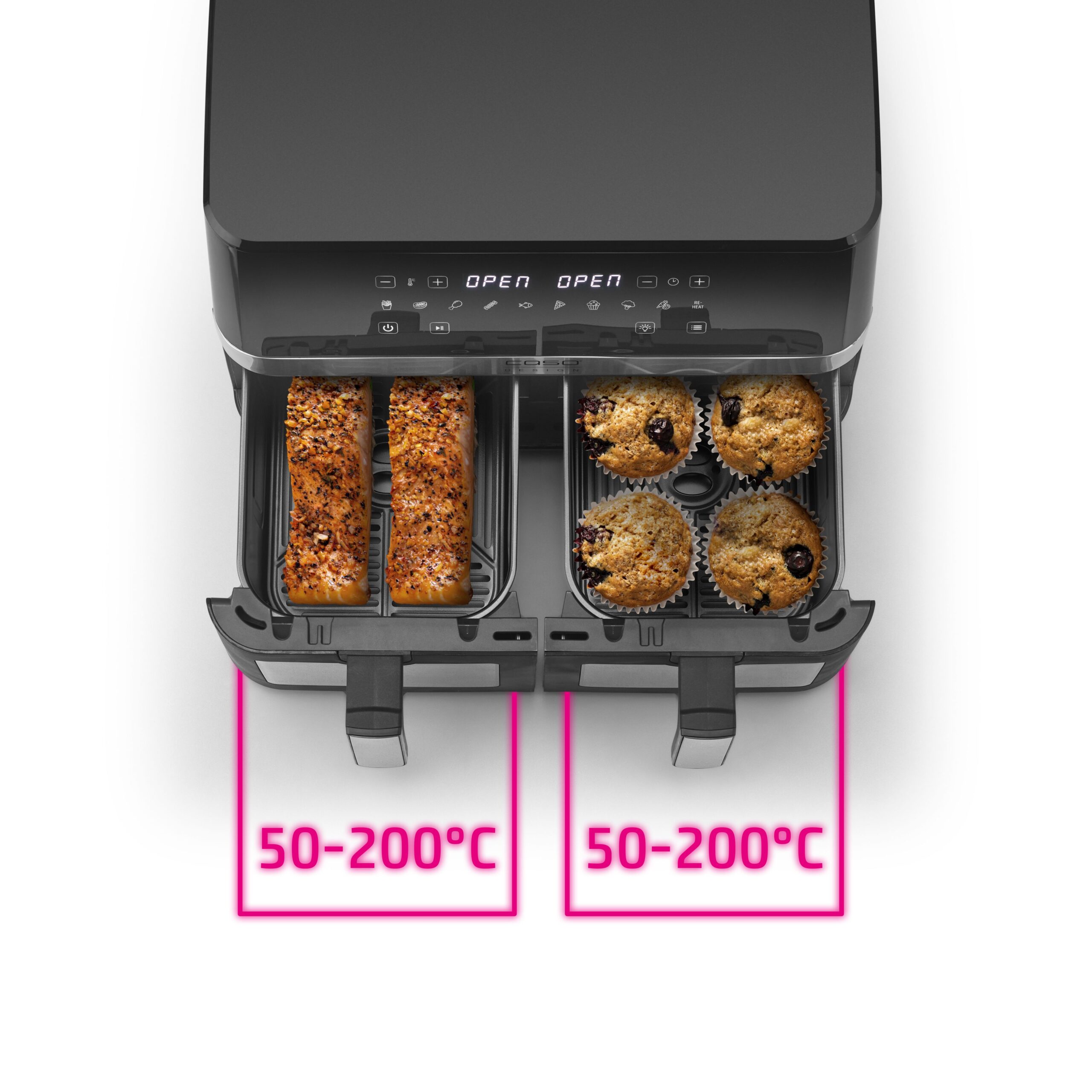 - Nagyméretű, kétkamrás forrólevegős sütő 14 liter össztérfogattal (kamránként 5,5 liter)