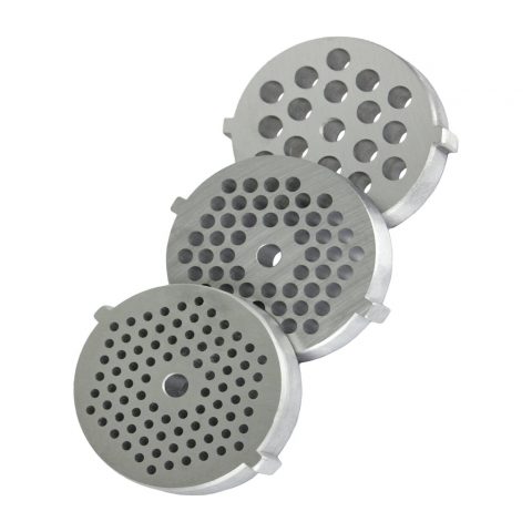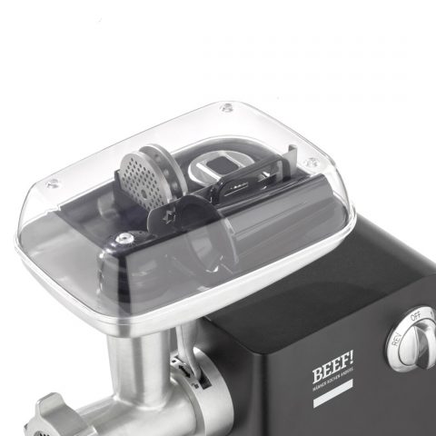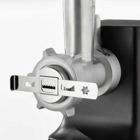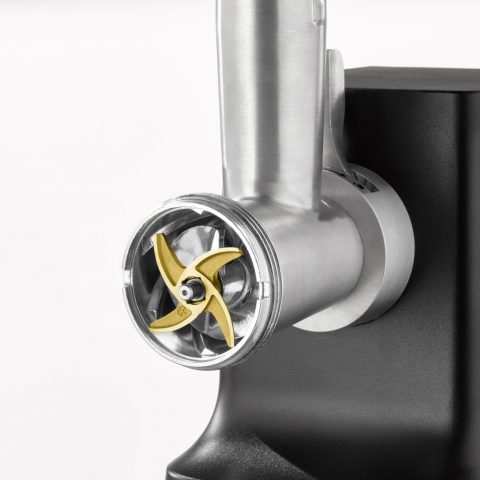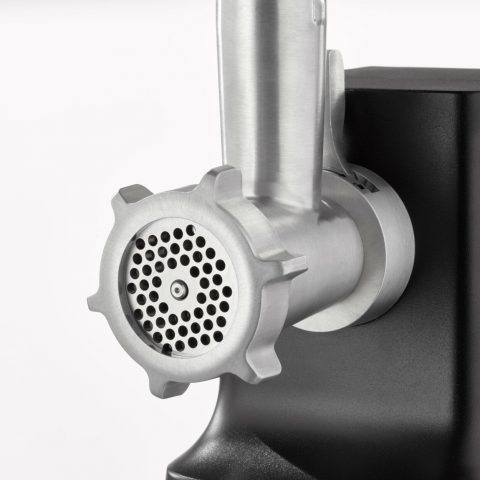 Elegáns kivitelű, alumíniumból készült, rozsdamentes acél pengével ellátott húsdaráló. Három féle vágótárcsával és sütemény profillal.